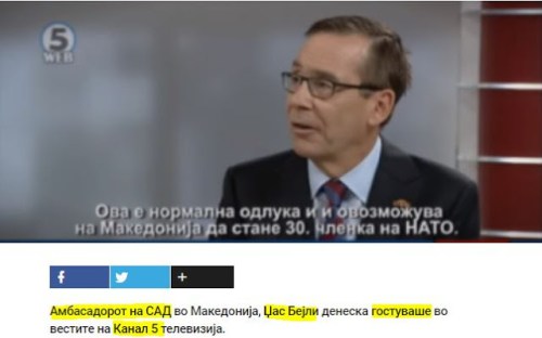 Ο Αμερικανός πρέσβης στα Σκόπια, Τζες Μπέιλι, ήταν σήμερα στο δελτίο ειδήσεων της τηλεόρασης ‘Κανάλ 5’.