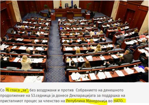 Με 76 ψήφους ‘υπέρ’ χωρίς αποχή και εναντίον, το Κοινοβούλιο κατά την 53η Σύνοδο εξέφρασε την υποστήριξη του στην ενταξιακή διαδικασία για την ένταξη της «Δημοκρατίας της Μακεδονίας» στο ΝΑΤΟ.