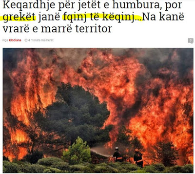 Αλβανική ιστοσελίδα, η οποία συχνά-πυκνά δημοσιεύει ιστορίες που αναφέρονται στα μέσα του 20ου αιώνα, σχετικά με τους Αλβανοτσάμηδες, κατηγορώντας, συνήθως, την Ελλάδα γενικότερα, φιλοξενεί ένα άρθρο, μετά τις φονικές πυρκαγιές στην ανατολική Αττική, όπου ο συντάκτης του θεωρεί ότι είναι κατάρα η γειτνίαση της Αλβανίας με την Ελλάδα…