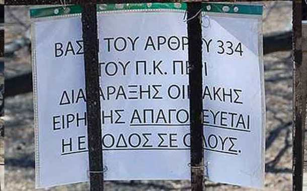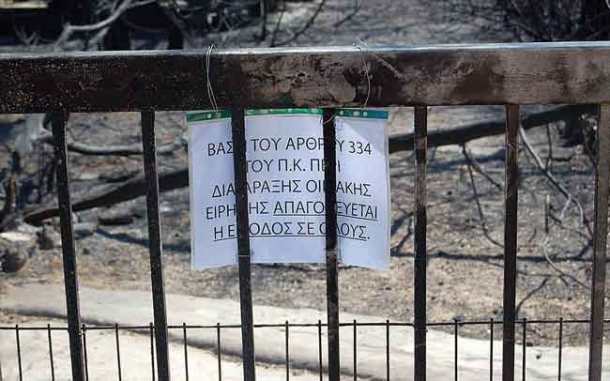 Κλειστή πόρτα με ένα ταμπελάκι που ανέφερε ότι απαγορεύεται η είσοδος βάση του νόμου περί «διάταξης οικιακής ειρήνης», βρήκαν οι πυροσβέστες – ερευνητές, στο οικόπεδο όπου βρέθηκαν απανθρακωμένες οι σοροί 28 πολιτών που δεν κατάφεραν να ξεφύγουν από την πύρινη λαίλαπα.