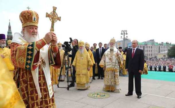 Ο Πρόεδρος της Ρωσίας Βλαντίμιρ Πούτιν, ο Πατριάρχης Μόσχας και πασών των Ρωσιών Κύριλλος και ο Πάπας και Πατριάρχης Αλεξανδρείας και πάσης Αφρικής Θεόδωρος Β΄ στους εορτασμούς για τα 1030 χρόνια από τον εκχριστιανισμό των Ρώσων από το Βυζάντιο.