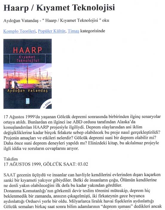 Στις 18 Νοεμβρίου του 2000 ένα γνωστό τουρκικό περιοδικό, το «Aksiyon» και μια μεγάλης κυκλοφορίας τουρκική εφημερίδα, η Star, δημοσίευσαν μια υποτίθεται συνταρακτική αποκάλυψη. Σύμφωνα με τους ισχυρισμούς του Aksiyon ο μεγάλος σεισμός της 16 Αυγούστου 1999 στην Τουρκία, που είχε δεκάδες χιλιάδες θύματα, δεν ήταν σεισμός, αλλά δοκιμή μιας νέου τύπου «ενεργειακής βόμβας». Η τουρκική επιθεώρηση υποστήριξε ότι υπάρχουν μεγάλα ερωτήματα που ενισχύουν την φοβερή αυτή αποκάλυψη.