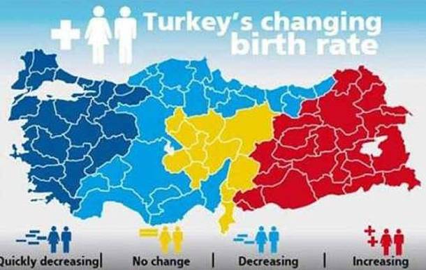 Σε όλη την Τουρκία οι γεννήσεις μειώνονται κάθετα. Εκτός από τις κουρδικές περιοχές της νοτιοανατολικής Τουρκίας ή τις μεγάλες πόλεις της δυτικής και βόρειας Τουρκίας που έχουν μεταναστεύσει Κούρδοι τις τελευταίες δεκαετίες.