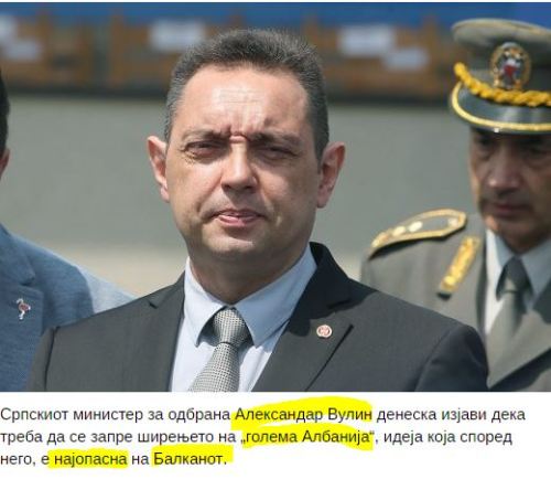 Ο υπουργός Άμυνας της Σερβίας, Αλεξάνταρ Βουλίν, δήλωσε σήμερα ότι θα πρέπει να σταματήσει η προπαγάνδα (διάδοση) της «Μεγάλης Αλβανίας», μια ιδέα που, σύμφωνα με τον ίδιο, είναι η πιο επικίνδυνη στα Βαλκάνια.