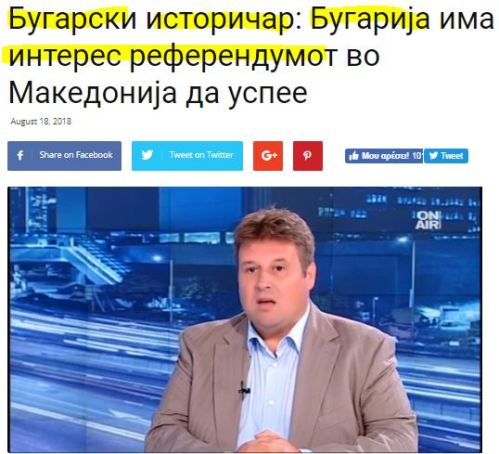 Ο Βούλγαρος ιστορικός, Στέφαν Ιβανόφ, εκτιμά ότι το δημοψήφισμα θα αποτελέσει δοκιμασία για τα Σκόπια, εάν, δηλαδή, ηττηθούν οι σκιές του παρελθόντος, και σύμφωνα με τον ίδιο, η Βουλγαρία έχει τελικό συμφέρον στην επιτυχία του δημοψηφίσματος της 30ης Σεπτεμβρίου για τη συμφωνία Ζάεφ- Τσίπρα.