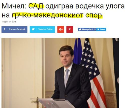 Ο αναπληρωτής βοηθός Γραμματέα των ΗΠΑ για την Ευρώπη και την Ευρασία, Γουές Μίτσελ, επανέλαβε ότι η χώρα του διαδραμάτισε καθοριστικό ρόλο στην επίλυση της σχεδόν τριών δεκαετιών διαμάχης μεταξύ της πΓΔΜ και της Ελλάδας, σχετικά με το όνομα του κράτους, γράφει σλαβικό δημοσίευμα των Σκοπίων.