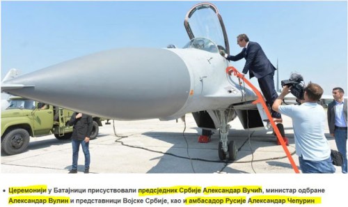 Η πολεμική αεροπορία της Σερβίας παρέλαβε από τη Ρωσία δύο αεροσκάφη τύπου Mig 29 κατά τη διάρκεια τελετής που έλαβε χώρα σε αεροπορική βάση κοντά στη σερβική πρωτεύουσα, παρουσία του προέδρου της Σερβίας, Αλεξάνταρ Βούτσιτς του Ρώσου πρέσβη στο Βελιγράδι, Αλεξάντερ Τσεπούριν.
