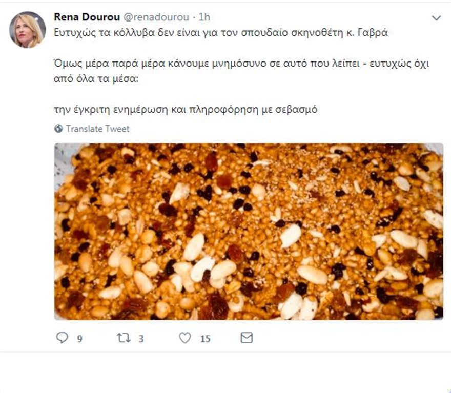 protothema Αυτή τη φορά η αντίδραση της περιφερειάρχου Ρένας Δούρου ήταν άμεση. Η κυρία «Governor of Attica» (έτσι υπογράφει τον λογαριασμό της στο twitter, δεν φταίμε εμείς), έσπευσε να αναρτήσει μια φωτογραφία με… κόλλυβα διευκρινίζοντας πως «Ευτυχώς τα κόλλυβα δεν είναι για τον σπουδαίο σκηνοθέτη κ. Γαβρά Όμως μέρα παρά μέρα κάνουμε μνημόσυνο σε αυτό που λείπει – ευτυχώς όχι από όλα τα μέσα: την έγκριτη ενημέρωση και πληροφόρηση με σεβασμό».
