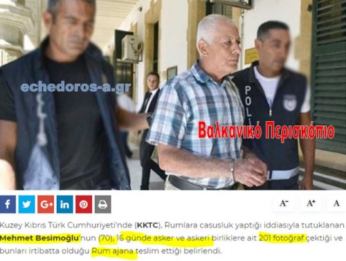 Ο Μεχμέτ Μπεζιμόγλου, ένας 70χρονος Τουρκοκύπριος παραδέχθηκε ότι έβγαζε φωτογραφίες στρατιωτικών εγκαταστάσεων στην Κατεχόμενη Κύπρο και τις έστελνε στους Ελληνοκύπριους πράκτορες. Το τουρκικό δημοσίευμα αναφέρει ότι παραδέχθηκε το έγκλημά του.