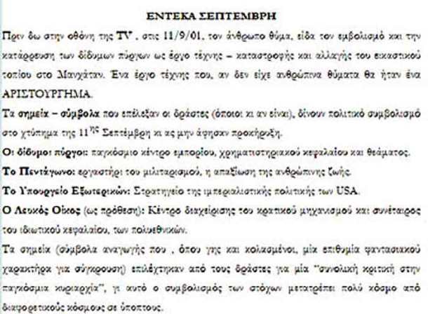 Η σημερινή ημέρα, 11η Σεπτεμβρίου, φέρνει στον νου μια παλαιότερη ανάρτηση του κ. Καρανίκα, ο οποίος χαρακτήριζε «έργο τέχνης, που αν δεν είχε ανθρώπινα θύματα θα ήταν ένα ΑΡΙΣΤΟΥΡΓΗΜΑ», την τρομοκρατική ενέργεια εναντίον των ΗΠΑ!