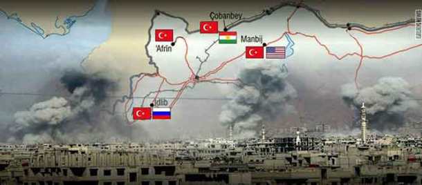 Η Τουρκία κατέχει και ελέγχει από κοινού την Μανμπίτζ με τις ΗΠΑ, από κοινού την Ιντλίμπ με την Ρωσία, την Αφρίν εξολοκλήρου μόνη της, βασιζόμενη και στις τουρκόφωνες δυνάμεις των Τουρκμένων της περιοχής και βρίσκεται σε απόσταση βολής από το ηρωικό Κομπάνι.