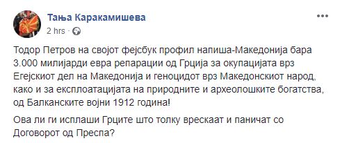 «Ο Τοντόρ Πετρόφ στο Facebook έγραψε ότι η ‘Μακεδονία’ απαιτεί 3.000 δις ευρώ ως αποζημίωση από την Ελλάδα για την κατάληψη της Μακεδονίας του Αιγαίου και της γενοκτονίας του ‘μακεδονικού’ λαού, καθώς και την αξιοποίηση των φυσικών και αρχαιολογικών θησαυρών από τους Βαλκανικούς πολέμους του 1912!»