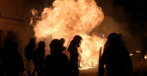 Επίθεση με βόμβες μολότοφ και πέτρες εξαπέλυσαν περίπου 50 κουκουλοφόροι στο Αστυνομικό Τμήμα της Ομόνοιας, με συνέπεια να διακομιστούν στο νοσοκομείο τρεις αστυνομικοί.