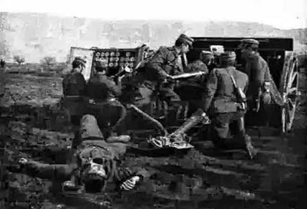 Κροτούν και τα δικά μας μάνλιχερ τώρα και αποκρίνονται θαρραλέως εις το πυρ των Τούρκων, οι οποίοι κατέχουν τας απέναντι πτυχάς του εδάφους, 600-700 μέτρα. Οι στρατιώται, άλλοι πρηνείς και άλλοι γονυπετείς, πυροβολούν με λύσσα και παίρνουν και θάρρος περισσότερο.