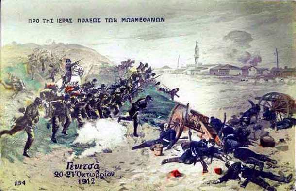 Η μάχη των Γιαννιτσών (19-20 Οκτωβρίου 1912) ήταν μία από τις σημαντικότερες μάχες του Α΄ Βαλκανικού Πολέμου κι αυτό γιατί η νίκη στα Γιαννιτσά άνοιξε το δρόμο για την απελευθέρωση της Θεσσαλονίκης. Συναρπαστική είναι η περιγραφή της μάχης από τον Πέτρο Βρυζάκη, αποσπάσματα της οποίας δημοσιεύονται παρακάτω: