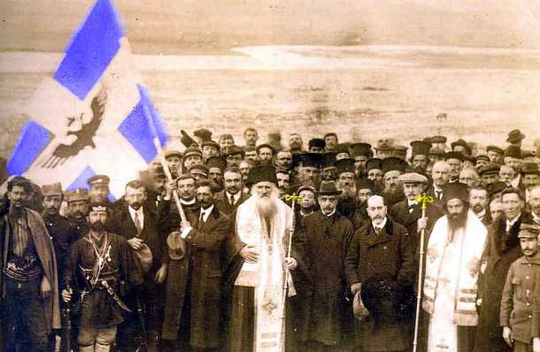Η επίσημη ανακήρυξη της βορειοηπειρωτικής αυτονομίας στο Αργυρόκαστρο, την 1η Μαρτίου 1914. Σε πρώτο πλάνο, ο Γεώργιος Χρηστάκης – Ζωγράφος, μέλη της κυβέρνησης, του κλήρου και του στρατού. Πηγή: Εθνικό και Ιστορικό Μουσείο, Αθήνα.