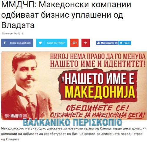 Το λεγόμενο «Μακεδονικό Διεθνές Κίνημα Ανθρωπίνων Δικαιωμάτων» από τον Καναδά, ισχυρίζεται ότι οι επιχειρήσεις τυπογραφίας και διαφήμισης στην πΓΔΜ αρνούνται να συνεργασθούν μαζί τους για να προωθήσουν αφίσες του κινήματος, από τον φόβο της κυβέρνησης, γράφει σλαβικό δημοσίευμα.