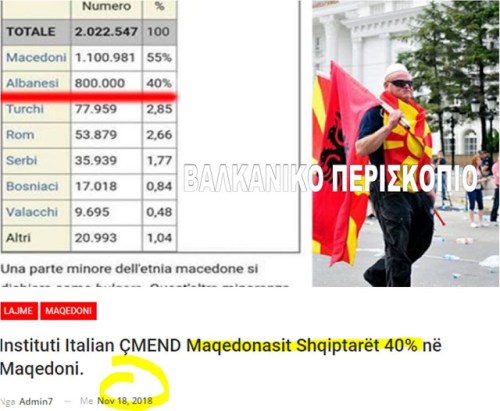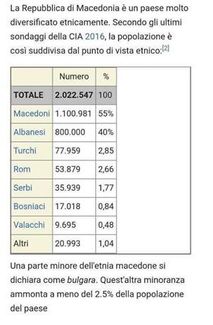 Σύμφωνα με έκθεση του Ιταλικού Περιφερειακού Ινστιτούτου σε συνεργασία με την αμερικανική Κεντρική Υπηρεσία Πληροφοριών (CIA), δημοσιεύει την κατανομή του πληθυσμού στη Δημοκρατία της Βόρειας Μακεδονίας (έτσι την αποκαλεί ‘ R. Maqedonisë Veriore’) και συγκεντρωτικά παρουσιάζει έναν πίνακα στον οποίο εμφαίνεται το ποσοστό επί τοις εκατό του πληθυσμού της χώρας με την εθνική διάκριση του.