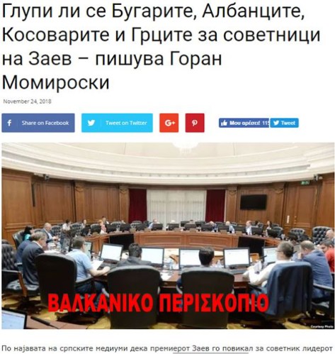» Αν κρίνουμε με την εκλογή των συμβούλων, η κυβέρνηση της χώρας μας (Σκόπια) και ο πρωθυπουργός μας, Ζόραν Ζάεφ, δεν είναι ειλικρινείς, όταν μιλάνε για ειλικρινή φιλία με Αθήνα και Σόφια…», γράφει το δημοσίευμα. πηγη