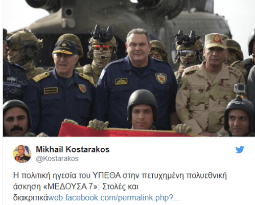 Με ανάρτησή του στο Facebook, ο Επίτιμος Α/ΓΕΕΘΑ Στρατηγός ε.α. Μιχαήλ Κωσταράκος παρατήρησε την συνήθεια του ΥΕΘΑ Π. Καμμένου να παρουσιάζεται δημοσίως ενδεδυμένος υπηρεσιακές στρατιωτικές στολές, φέροντας επ’ αυτών διακριτικά στρατιωτικών σχολείων.