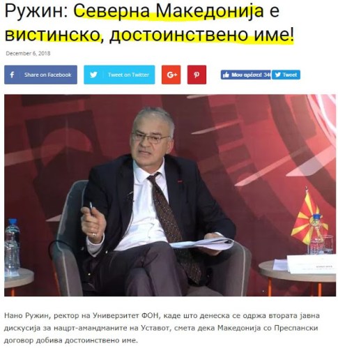 Ο Νάνο Ρουζίν, πρύτανης του Πανεπιστημίου ΦΟΝ των Σκοπίων, όπου διεξήχθη σήμερα η δεύτερη δημόσια συζήτηση σχετικά με τα σχέδια τροποποίησης του Συντάγματος, πιστεύει ότι η χώρα με τη Συμφωνία των Πρεσπών αποκτά ένα αξιοπρεπές όνομα.