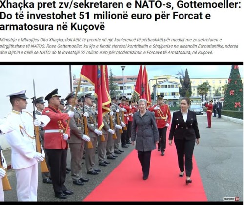 Η υπουργός Άμυνας της Αλβανίας, Όλτα Τζάσκα είχε την Παρασκευή κοινή συνέντευξη Τύπου με την αναπληρώτρια Γραμματέα του ΝΑΤΟ, Ρόζε Γκότεμούλερ η οποία τόνισε ότι η Ευρω-ατλαντική συμμαχία θα επενδύσει 51 εκατομμύρια ευρώ για τον εκσυγχρονισμό της αεροπορικής βάσης στην Κουσόβα.