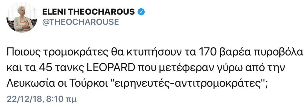 26106-2018-12-23_204821 Published 23 Δεκεμβρίου, 2018 at 1044 × 366 in Σοβαρότατη καταγγελία από την ευρωβουλευτή Ελένη Θεοχάρους για πολεμικές προετοιμασίες στα κατεχόμενα. ← Προηγούμενο Επόμενο →