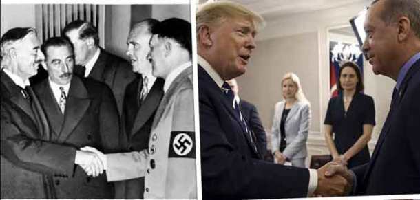 Η δημοσιογράφος Uzay Bulut από την Τουρκία, σε μία ανάλυσή της στο Gatestone Institute γράφει ότι ο Τραμπ με αυτή την απόφαση κάνει το ίδιο λάθος που είχε κάνει ο Βρετανός πρωθυπουργός Νέβιλ Τσαμπερλέϊν όταν πίστεψε ότι είχε συμφωνήσει με τον Χίτλερ! Στη θέση του Χίτλερ προφανώς τοποθετεί τον Ερντογάν…