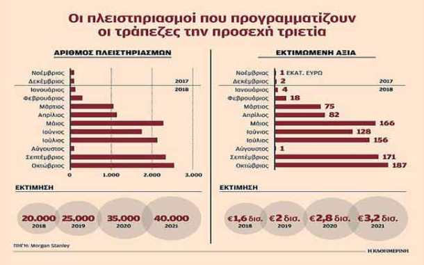 Μέσω της ηλεκτρονικής πλατφόρμας eauction έχουν προγραμματιστεί 4.000 πλειστηριασμοί για τους προσεχείς μήνες και συγκεκριμένα έως και τον Ιούλιο του 2019. Στη λίστα περιλαμβάνεται πλήθος διαμερισμάτων μεσαίας ή μικρής αξίας, δηλαδή κάτω των 100.000 ευρώ, οι κάτοχοι των οποίων, όπως υποστηρίζουν οι τράπεζες, δεν έχουν ανταποκριθεί σε προσπάθειες ρύθμισης της οφειλής, καθώς και μικρά ή μεγάλα καταστήματα ή εμπορικοί χώροι.