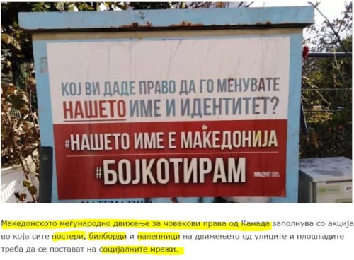 Ο επικεφαλής της σλαβικής αυτής οργάνωσης του Καναδά, ο Μπίλ Νικόλοφ, σημειώνει: «τραβήξτε φωτογραφίες και φορτώστε τες στα κοινωνικά δίκτυα. Βάλτε ως σημείωση από κάτω τα στοιχεία μου: «@mhrmi. Обединети во одбрана на #МАКЕДОНИЈА”- «ενωμένοι στην υπεράσπιση της #Μακεδονίας».