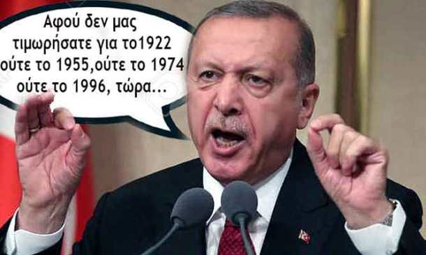 Στην ομιλία του στη Σμύρνη ο Τούρκος Πρόεδρος είπε: «Ο μακαρίτης Μουχαρέμ Ερτάς έχει ένα λαϊκό τραγούδι που μιλά για την κατοχή της Σμύρνης. Κοιτάξτε τα συναισθήματα δημιούργησαν στον λαό μας εκείνες οι μαύρες μέρες της κατοχής».