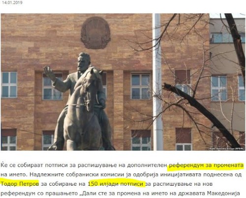 Σε πρόταση που κατατέθηκε στις αρμόδιες κοινοβουλευτικές επιτροπές, προβλέπεται η συγκέντρωση 150 χιλιάδων υπογραφών για ένα νέο δημοψήφισμα στην πΓΔΜ με το ερώτημα εάν γίνεται δεκτό το νέο όνομα της χώρας να είναι «Δημοκρατία της Βόρειας Μακεδονίας».