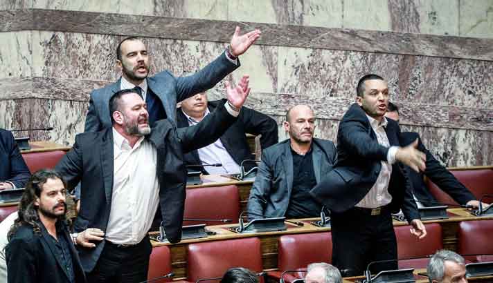 Οι βουλευτές της Χρυσής Αυγής απάντησαν στους εθνομηδενιστές και η ιαχή «ΠΡΟΔΟΤΕΣ-ΠΡΟΔΟΤΕΣ» κάλυψε για ώρα τα έδρανα της βουλής.