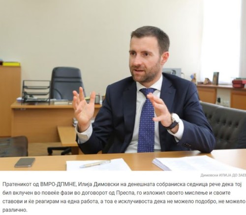 Ο βουλευτής του κόμματος της αξιωματικής αντιπολίτευσης του VMRO-DPMNE, Ιλία Ντιμόφσκι, ο οποίος συμμετείχε σε διάφορες φάσεις της Συμφωνίας των Πρεσπών, εξέφρασε τις θέσεις του στις κοινοβουλευτικές συνεδριάσεις τονίζοντας ότι «η Συνθήκη αυτή δεν δίνει λύσεις σε θέματα που θα τα βρούμε μπροστά μας».
