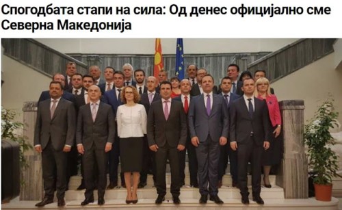 «Αναφέρουμε ότι από σήμερα, 12 Φεβρουαρίου 2019, τίθεται σε ισχύ η Τελική Συμφωνία για την επίλυση των διαφορών που περιγράφεται στα ψηφίσματα 817 (1993) και 845 (1993) του Συμβουλίου Ασφαλείας των Ηνωμένων Εθνών, για την ακύρωση της Ενδιάμεσης Συμφωνία του 1995 και τη δημιουργία στρατηγικής εταιρικής σχέσης μεταξύ των μερών, των υπουργείων Εξωτερικών αντίστοιχα στην Εφημερίδα της Κυβερνήσεως.