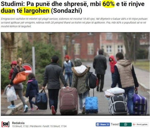 Η μετανάστευση εξακολουθεί να αποτελεί σοβαρό τραυματισμό στη χώρα, ιδιαίτερα στις ηλικίες 18-45 ετών. Τον Δεκέμβριο του περασμένου έτους το 44% των νέων έχει δηλώσει ότι υπέβαλε αίτηση για μετανάστευση, ενώ περίπου το 20% δήλωσε ότι σχεδιάζει να υποβάλλει αίτηση. Έτσι πάνω από το 60% των νέων της χώρας θέλει να φύγει από την Αλβανία.