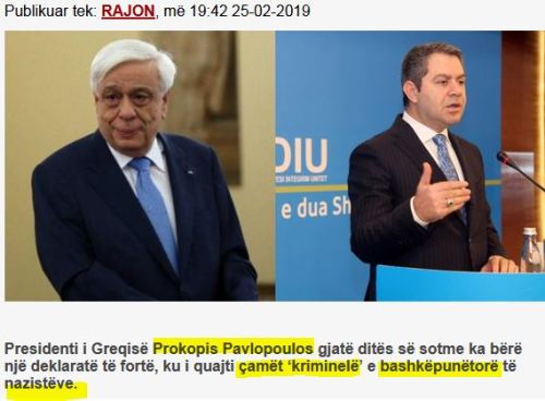 Ο πρόεδρος της Ελλάδας, Προκόπης Παυλόπουλος, έκανε σήμερα μια σκληρή δήλωση, αποκάλεσε τους τσάμηδες ‘εγκληματίες’ και συνεργάτες των Ναζί, γράφει το αλβανικό δημοσίευμα και συνεχίζει: