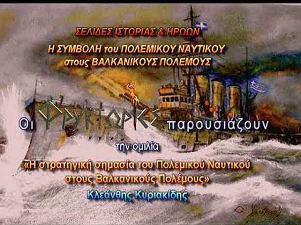 Η στρατηγική σημασία του Πολεμικού Ναυτικού στους Βαλκανικούς Πολέμους Posted on 4 Μαρτίου, 2019 by Μιλήσιος Σχολιάστε Οι ΦΡΥΚΤΩΡΙΕΣ παρουσιάζουν την ομιλία «Η στρατηγική σημασία του Πολεμικού Ναυτικού στους Βαλκανικούς Πολέμους». Ομιλητής: ΚΛΕΑΝΘΗΣ ΚΥΡΙΑΚΙΔΗΣ, Διεθνολόγος, Δρ. Πανεπιστημίου Αιγαίου. Φρυκτωρίες διαδικτυακό κανάλι Κοινοποιήστε:Tweet Κλικ για αποστολή ενός συνδέσμου μέσω email σε έναν/μία φίλο/η(Ανοίγει σε νέο παράθυρο) Email Κλικ για εκτύπωση(Ανοίγει σε νέο παράθυρο) Εκτύπωση Μου αρέσει! Φόρτωση... Σχετικά