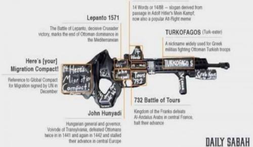Επάνω στο όπλο και τους γεμιστήρες έγραφε συνθήματα μίσους ή ανέφερε γεγονότα-σταθμούς σε πολέμους εναντίον κυρίως των Οθωμανών, θέλοντας να δείξει με τον αρρωστημένο τρόπο του ότι ήταν «συνεχιστής» στον «αγώνα» κατά των αλλόθρησκων.
