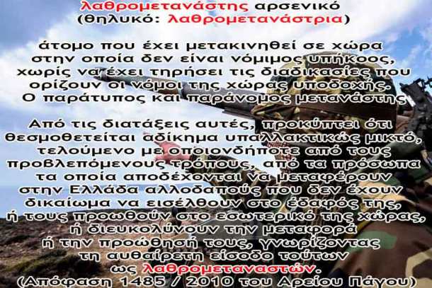 Οσον αφορά, δε, το θέμα της διαταγής, στην οποία γίνεται λόγος για «αδόκιμους όρους» εκ μέρους του στρατιωτικού προσωπικού προς τους ανθρώπους που αποβιβάζονται στα νησιά ή διαμένουν στις δομές φιλοξενίας, καλώντας στελέχη και στρατιώτες να τους αποκαλούν «πρόσφυγες ή μετανάστες για να αποτυπώνεται η πραγματική διάσταση του φαινομένου χωρίς να θίγεται η ανθρώπινη αξιοπρέπεια», γιατί παραλείπεται ο όρος «παράνομος μετανάστης»;