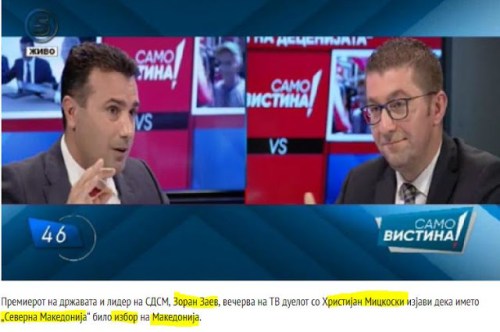 Ο πρωθυπουργός του κράτους και ηγέτης της SDSM, Ζόραν Ζάεφ, απόψε στην τηλεοπτική μονομαχία με τον Χρίστιαν Μίτσκοσκι, δήλωσε ότι το όνομα «Βόρεια Μακεδονία» ήταν επιλογή της ‘Μακεδονίας’.