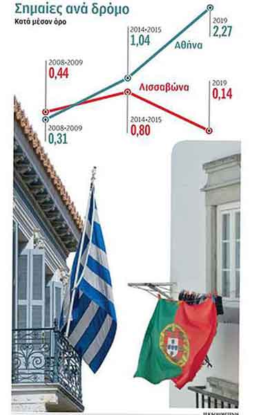 Την περίοδο 2008-2009, στην Αθήνα υπήρχαν κατά μέσον όρο 0,31 σημαίες ανά δρόμο, ενώ στη Λισσαβώνα 0,44 σημαίες ανά δρόμο.