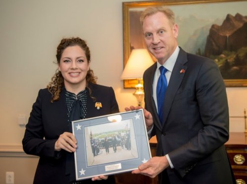 Η υπουργός Άμυνας της Αλβανίας, Όλτα Τζάσκα στην επίσημη επίσκεψή της στο Πεντάγωνο, η δεύτερη μέσα σε ένα χρόνο, έγινε δεκτή από τον υπουργό Άμυνας των ΗΠΑ, Πάτρικ Σανάχαν.