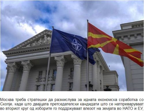 Η Μόσχα θα πρέπει να σκεφτεί το μέλλον της οικονομικής συνεργασίας με τα Σκόπια, όπου οι δύο υποψήφιοι πρόεδροι ανταγωνίζονται ποιος θα υποστηρίξει περισσότερο την ένταξη στο ΝΑΤΟ και την ΕΕ, υποστηρίζει ο Βλαντίμιρ Ολεντσένκο, ανώτερος συνεργάτης στο Εθνικό Ινστιτούτο Παγκόσμιας Οικονομίας και των διεθνών σχέσεων «Πριμακόφ» στη Ρωσική Ακαδημίας Επιστημών, όπως αναφέρει το πρακτορείο Tass.
