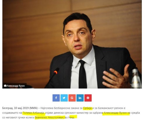 Η μεγαλύτερη απειλή για την ασφάλεια στη Σερβία και την περιοχή των Βαλκανίων, είναι η δημιουργία της Μεγάλης Αλβανίας, δήλωσε ο Σέρβος υπουργός Άμυνας Αλεξάνταρ Βουλίν στη συνάντηση με τον Έλληνα ομόλογό του, Ευάγγελο Αποστολάκη στην Νις.