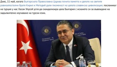 «Σήμερα 11 Μαΐου, που η Βουλγαρική Ορθόδοξη Εκκλησία τιμά τη μνήμη και το έργο των Αγίων ισαποστόλων αδελφών Κυρίλλου και Μεθοδίου και τη γραφή ολόκληρου του σλαβικού πολιτισμού, ο πρέσβης της Τουρκίας στη Βουλγαρία, Χασάν Ουλουσόι, κατάφερε να σκανδαλίσει ολόκληρη τη Βουλγαρία με το αίτημά του να εισαχθεί η υποχρεωτική εκμάθησης της τουρκικής γλώσσας», γράφει το βουλγαρικό δημοσίευμα.