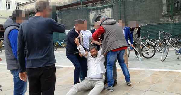 Εκεί αμέσως οι ασφαλίτες τον περικύκλωσαν και του ζήτησαν να φύγει. Μετά την άρνηση του άρχισαν να τον σπρώχνουν και πιάνοντάς τον από τις μασχάλες άρχισαν να τον σέρνουν μακριά.