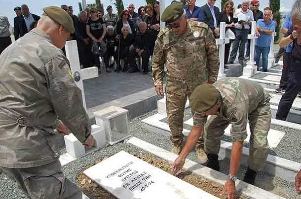 Τα Μαρτυρικά Οστά του εντοπίστηκαν στο κοιμητήριο της σκλαβωμένης Μόρφου, ταυτοποιήθηκαν με τη μέθοδο DNA και κηδεύτηκαν χθες με τις αρμόζουσες σε στρατηγό τιμές, σε πάνδημη κηδεία στη Λευκωσία.