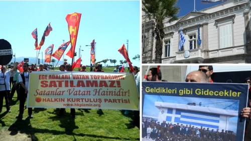 «Θα φύγετε όπως ήλθατε», γράφει ένα από τα πανό των διαδηλωτών που στην πλειοψηφία τους ήταν γέροντες. Σε ένα άλλο πανό έγραφε «Tsipra Go Home» Η φαρσοκωμωδία συνεχίστηκε με τους διαδηλωτές να εξηγούν ότι η Ελλάδα παραβίασε τη Συνθήκη της Λωζάνης του 1923 κει εξόπλισε τα νησιά αυτά.( προφανώς οι εθνικιστές του πρώην ταξιάρχου είναι και απληροφόρητοι αφού το θέμα εξοπλισμού των νησιών, εμπεριέχεται στις πρόνοιες της συνθήκης του Μοντρέ).