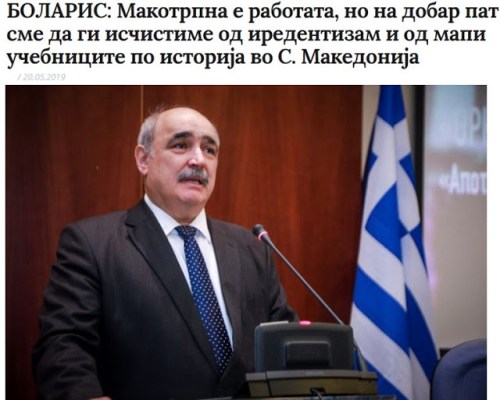 Ο Μπόλαρης, ο οποίος είναι επικεφαλής της ελληνικής ομάδας στο πλαίσιο της Επιτροπής για τα σχολικά βιβλία, επαναλαμβάνει ότι είναι απαραίτητο από τα βιβλία, τους χάρτες και άλλο συνοδευτικό υλικό, να εξαλειφθούν τυχόν ψευδείς και ρεβιζιονιστικοί ισχυρισμοί.